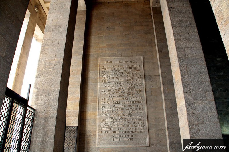 Mozole 72x52x17 metre boyutlarında uzunca dikdörtgen bir plan üzerine kurulmuş olup, ön ve arka sekiz, yan cepheler ise 14,40 m yüksekliğinde on dört kolonatla çevrelenmiştir. Mozole cephesinde, solda Atatürk'ün Türk gençliğine, sağda ise Cumhuriyet'in kuruluşunun 10. yıldönümünde söylediği Onuncu Yıl Nutku yer almaktadır. Harfler taş kabartma üzerine altın yaldızla yazılmıştır.