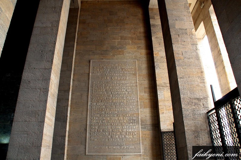 Şeref Holü'ne bronz kapılardan girilir. Girişte sağda Atatürk'ün 29 Ekim 1938 tarihli Türk ordusuna son mesajı, solda ise II. Cumhurbaşkanı İsmet İnönü'nün Atatürk'ün ölümü üzerine yayınladığı 21 Kasım 1938 tarihli Türk milletine söylediği taziye mesajı yer almaktadır. Bu iki yazıt Atatürk'ün doğumunun 100. yılı olan 1981’de yazılmıştır.
